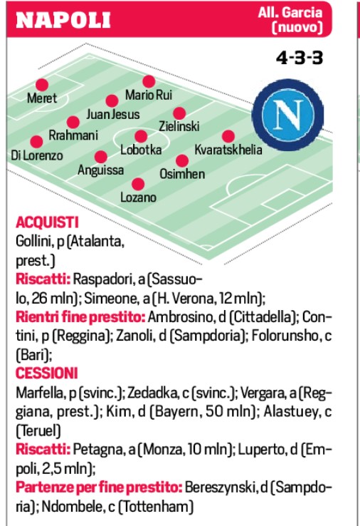 Il Napoli non è “obbligato” a muoversi sul mercato, paradossalmente, anche nel ruolo dove c’è stata la partenza “dolorosa” in realtà non è scoperto, avendo in squadra 3 difensori centrali. Ovvio che comunque il club stia lavorando per cogliere le occasioni propizie che si presenteranno, per sciogliere dei nodi, per monitorare le eventuali esigenze e richieste. In questa immagine, al momento, la situazione, tra partenze, rientri, fine prestito e cessioni: