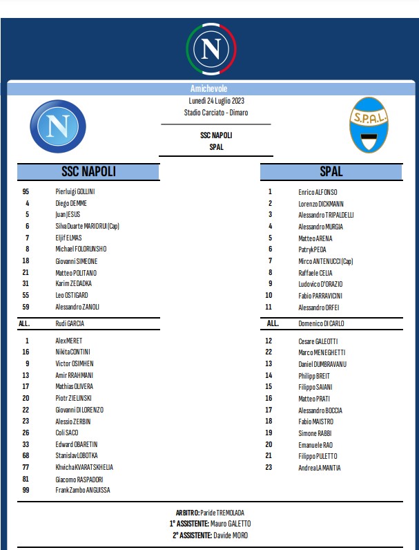 NAPOLI (4-3-3): Gollini; Zanoli, Ostigard, Juan Jesus, Mario Rui; Folorunsho, Demme, Elmas; Politano, Simeone, Zedadka. All. Garcia. A disposizione: Meret; Contini, Rrahmani, Obaretin, Olivera, Di Lorenzo, Anguissa, Saco, Lobotka, Zielinski, Zerbin, Kvaratskhelia, Raspadori, Osimhen