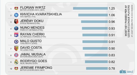 Il fantasista georgiano del Napoli si piazza al secondo posto della speciale classifica del Cies – Centro Internazionale di Studi sullo Sport – sugli Under 23 dei campionati europei con maggiori passaggi chiave durante la partita. 1,06 per partita per Kvara contro l’1,26 del fantasista tedesco. Chiude il podio Jeremy Doku, stella nascente dello Stade Rennais (0,96).