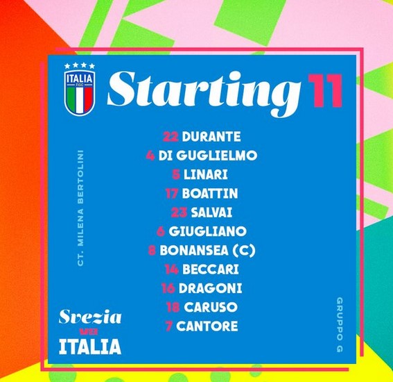 ITALIA (4-3-3): Durante; Di Guglielmo, Linari, Salvai, Boattin; Dragoni, Giugliano, Caruso; Bonansea, Beccari, Cantore. All. Bertolini