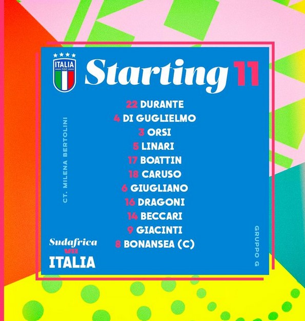 SUDAFRICA (4-2-3-1): Swart; Ramalepe, Mbane, Gamede, Holweni; Jane, Kgoale; Seoposenwe, Mothalo, Magaja; Kgatlana. Allenatore: Ellis. A disposizione: Dlamini, Moletsane, Matlou, Magama, Dhlamini, Cesane, Salgado, Makhubela, Kgadiete, Moodaly, Shingwe