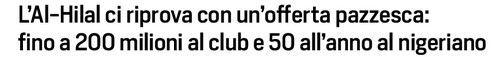 L’Al-Hilal ci riprova con un’offerta pazzesca: fino a 200 milioni al club e 50 all’anno al nigeriano