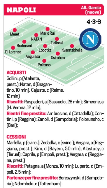 Il Napoli di Rudi Garcia è pronto ad affrontare il Frosinone nella prima gara del campionato di Serie A. Come riportato dal Corriere dello Sport, il modulo degli azzurri sarà lo stesso utilizzato da Spalletti. 4-3-3 di partenza che può variare a seconda delle situazioni. Natan al posto di Kim al centro della difesa e Cajuste come vice-Anguissa gli unici due cambi nella rosa. Si attendono altri colpi, con Gabri Veiga sempre in cima alla lista dei desideri. Ecco il grafico del quotidiano: