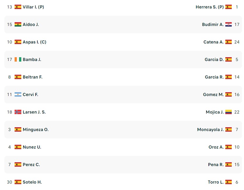 Celta Vigo, panchina: – Starfelt C. 12 Dotor C. 26 Domínguez C. 11 Cervi F. 24 Veiga G. 9 Gonçalo Paciência 37 Sotelo H. 31 Coke Carrillo 20 Vázquez K. 23 de la Torre L. 28 Rodríguez M. 19 Swedberg W