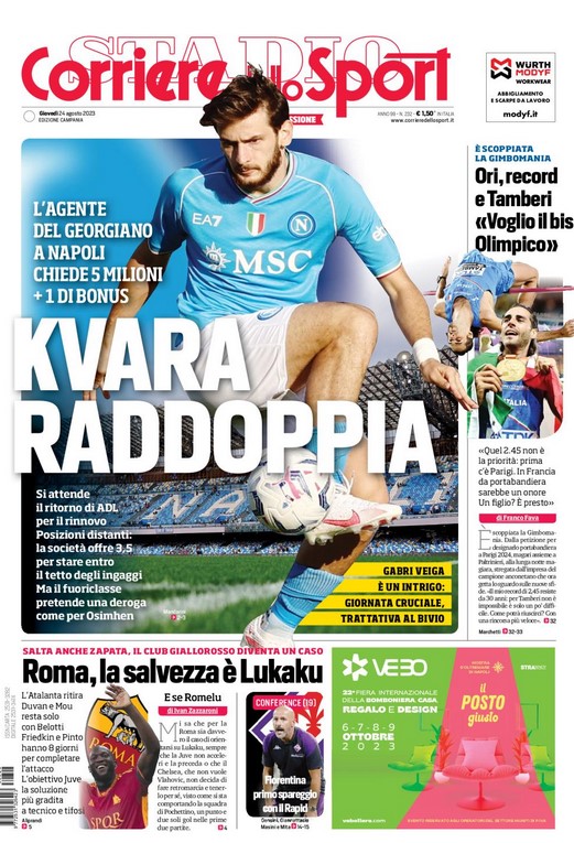 NewsCalcioRassegna Stampa ” KVARA RADDOPPIA”. Il georgiano vuole un a deroga come per Osimhen By Giuseppe Sacco il Ago 24, 2023 - 07:20:59 0 Condividi In primo piano sul Cds edizione Campania Factory della Comunicazione CalcioContrattoKvaraNapoli 0 Condividi FacebookTwitterGoogle+ReddItWhatsAppPinterestE-mail