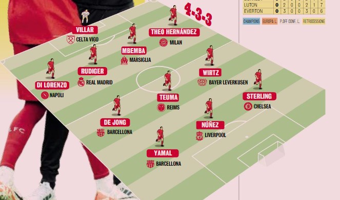 In difesa i terzini sono made in Serie A: il napoletano Giovanni Di Lorenzo da una parte e il milanista Theo Hernandez dall’altra.Al centro obbligatori i nomi di Antonio Rudiger e Chancel Mbemba, ormai sempre più leader di Real e Marsiglia. La regia del centrocampo è affidata a Frenkie de Jong del Barcellona, che quando è chiamato in causa risponde sempre presente. Ad affiancarlo Florian Wirtz, 20enne del Leverkusen già nel mirino delle big europee. Chiudiamo il reparto con l’esperienza, e la doppietta, di Teddy Teuma, nazionale maltese del Reims. Il tridente d’attacco è guidato da Darwin Núñez, che con una doppietta nei minuti finali regala al Liverpool una incredibile vittoria contro il Newcastle, che ha giocato più di 60’ con un uomo in più. Completano la squadra la nuova stella del Barcellona, il 16enne Lamine Yamal, e un Raheem Sterling che finalmente si sta prendendo il Chelsea sulle spalle. fonte: Gazzetta