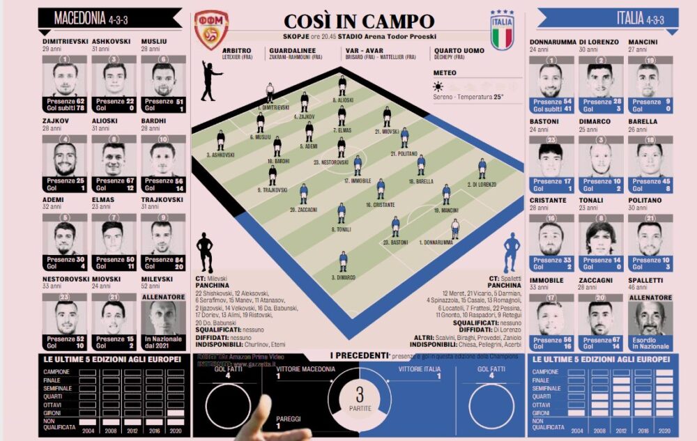 Ore 20,45 – La Gazzetta mette in campo la sua Macedonia Italia. Due azzurri e due napoletani in formazione (Grafico)
