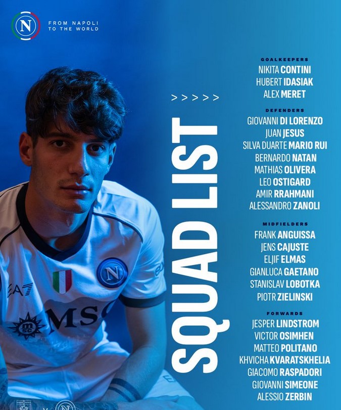 Ecco l’elenco completo: Nikita Contini, Hubert Idasiak, Alex Meret; Giovanni Di Lorenzo, Juan Jesus, Mario Rui, Natan, Mathias Olivera, Leo Ostigard, Amir Rrahmani, Alessandro Zanoli; Franck Anguissa, Jens Cajuste, Elijf Elmas, Gianluca Gaetano, Stanislav Lobotka, Piotr Zielinski; Jesper Lindstrom, Victor Osimhen, Matteo Politano, Khvicha Kvaratskhelia, Giacomo Raspadori, Giovanni Simeone, Alessio Zerbin.