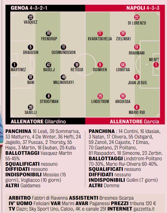 L’astinenza di Khvicha non mi preoccupa, darà il solito apporto di gol e assist». C’è tanta attesa per Natan, che si prepara ad esordire, stasera o forse poco dopo, in uno dei sette impegni che gli azzurri dovranno sostenere in 22 giorni. «Ora è più pronto, in questo periodo abbiamo fatto dei lavori specifici. Peraltro aveva un fastidio al ginocchio quando l’abbiamo acquistato». Oltre a Demme, fuori rosa, soltanto Gollini non sarà a Genova. Fonte e grafico Gazzetta