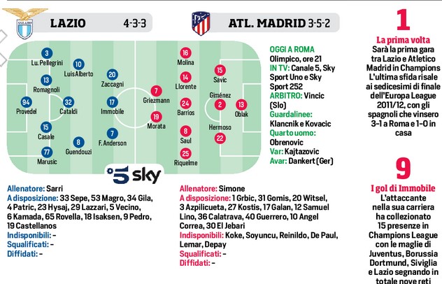 Champions: Lazio-Atletico Madrid – Le possibili formazioni, l’orario e dove seguirle in tv