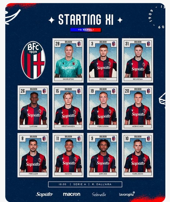 Bologna (4-3-3): Skorupski; Posch, Beukema, Lucumi, Kristiansen; Ferguson, Aebisher, Freuler; Ndoye, Zirkzee, Karlsson. All. Motta