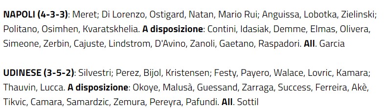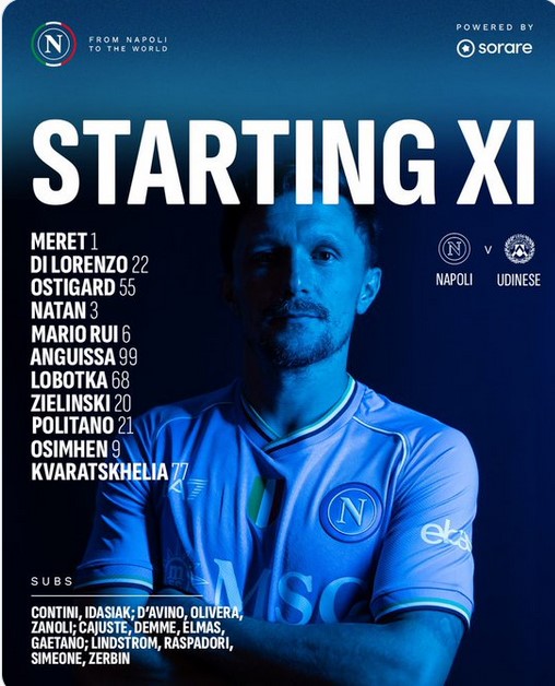 Napoli in maglia azzurra, calzoncini bianchi, calzettoni azzurri; l’Udinese in maglia bianca con banda centrale nera, calzoncini e calzettoni neri. Capitani: Di Lorenzo e Walace. De Laurentiis presente in tribuna.
