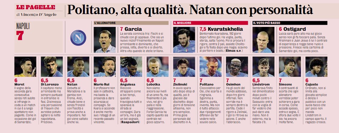 Sono i risultati, da sempre, che mettono a tacere le polemiche, quelle del campo e quelle extra. Ancor meglio se unita a questo c’è la prestazione. In realtà, un buon Napoli, serio e equilibrato si era visto anche a Bologna, ma al Dall’Ara era mancata la rete, anche per un pizzico di sfortuna. Ieri sera al Maradona, invece, gli azzurri hanno ritrovato il gol. Quello di Kvara, delizioso e che mancava da tanto, quello di Simeone, come da subentrante di classe, che anno fatto seguito a quello “pesante” di Zielinski su rigore e quello liberatorio di un Osimhen di cui si era troppo parlato per altre vicende. Il tutto condito da buone catene esterne, tenuta del centrocampo, buona resa in difesa. Bene anche i cambi. La Gazzetta dello Sport vota così gli azzurri: