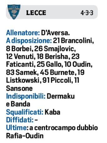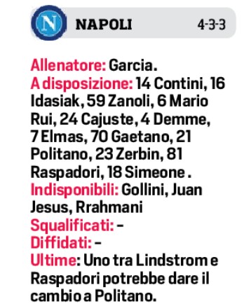 La serie ravvicinata, che tra l’altro si concluderà soltanto domenica 8 ottobre dopo la sfida con la Fiorentina, l’ultima prima della sosta, impone riflessioni. Valutazioni tecniche, più che altro di condizione psicofisica: lo stress e le tossine sono del corpo e della mente, e così Garcia sta pensando di cambiare qualcosa. Del tipo: domani Politano potrebbe riposare e sia Raspadori sia Lindstrom, reduce da un impatto molto convincente con l’Udinese dalla panchina, si candidano a cominciare dall’inizio. E ancora: Mario Rui-Olivera è un testa a testa tra amici destinato a trascinarsi come una costante, e non è esclusa una novità anche a centrocampo. Oggi, in occasione della rifinitura in agenda al centro sportivo di Castel Volturno prima della partenza per Lecce, le indicazioni saranno più attendibili (quella di ieri è stata una seduta prettamente di scarico). Sempre fuori causa Rrahmani, Juan Jesus e Gollini.