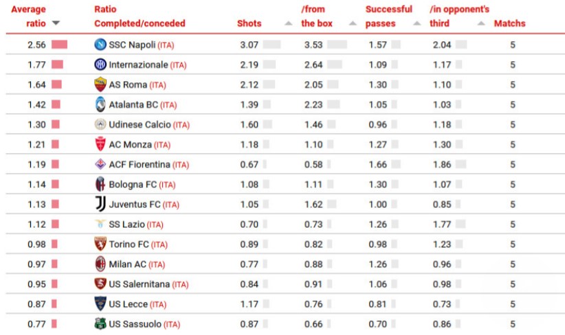 Il Napoli sta dominando il campionato. Lo dicono i dati provenienti da 69 campionati raccolti dal Cies – Centro internazionale di studi sportivi – in collaborazione con Wyscout, e organizzati in una speciale classifica sulla base del rapporto medio di prestazione contro le squadre avversarie per quattro azioni di gioco: tiri, tiri dentro l’area, passaggi e passaggi nella trequarti avversaria.Gli azzurri di Rudi Garcia, nonostante un avvio di campionato a luci e ombre, dopo le prime cinque giornate – quindi senza considerare il poker rifilato all’Udinese ieri al Maradona – si piazzano al primo posto di questa graduatoria, con un rapporto medio di 2.56 punti. L’Inter, seconda in classifica, colleziona appena 1.77 punti, mentre al terzo gradino del podio c’è la Roma con 1.64. Nessuno, nelle prime cinque giornate di questa Serie A, ha tirato più degli azzurri, che vantano 3.07 punti per le conclusioni generali (Inter a 2.19) e 3.53 per quelle tentate in area di rigore avversaria (secondi ancora i nerazzurri a 2.64).