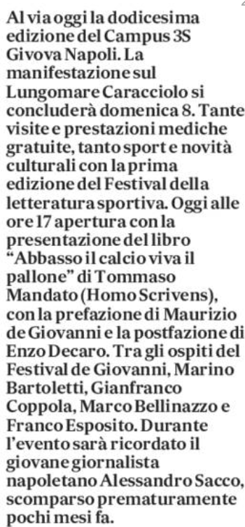 Anche sulle pagine de Il Mattino la novità di quest’anno al Campus3sGivova, il FESTIVAL della letteratura sportiva