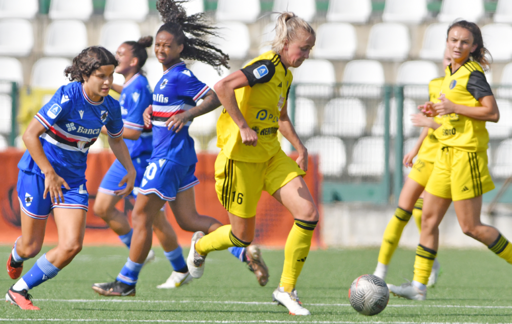 lariane gela le padrone di casa, punite dopo nemmeno due minuti: grande break di Skorvankova, la slovacca dal limite serve Karlernäs e la svedese col mancino non sbaglia. La reazione delle blucerchiate arriva al 12’: traversa piena colpita da Giordano, che dopo un’efficacissima percussione in solitaria si vede negare l’1-1 dal primo legno del match. Dopo tre minuti sono invece le ospiti ad andare ancora a bersaglio: Sevenius lavora bene il pallone sulla sinistra e lo mette in mezzo, il controllo difettoso di Karlernäs diventa un assist per Skorvankova e la slovacca, dopo il passaggio vincente nell’azione del vantaggio, mette a referto anche il suo primo centro nel campionato italiano. Nonostante il secondo gol incassato, la Samp insiste e al 18’ un altro legno (traversa di Heroum su punizione) vanifica la terza occasione da gol delle undici di Mango. Gol che le liguri trovano al 36’ con Tarenzi, ma all’attaccante viene fischiata una posizione di fuorigioco e anche in questo caso il parziale rimane invariato. A inizio ripresa il Como torna a tenere il pallino del gioco, ma le blucerchiate non demordono e dopo l’ennesima occasione sfumata, questa volta con Oliviero, accorciano le distanze al minuto 75: mancino chirurgico di Giordano dal limite e gara riaperta. L’ultimo quarto d’ora del match si trasforma in un assedio delle padrone di casa, che però non frutta il secondo gol. Al triplice fischio sono le lariane a festeggiare i tre punti, nonché un ottimo avvio di stagione che al momento le vede terze in solitaria a quota sei nell’attesa dei risultati di Inter e Fiorentina, entrambe in campo domenica.