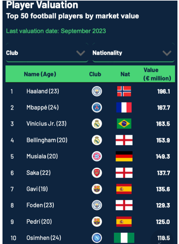 Come ogni anno, arriva puntuale lo studio 2023 di Football Benchmark, la piattaforma specializzata che analizza il valore economico dei club sportivi in giro per il mondo e anche degli atleti che vi appartengono. Per il calcio, quest’anno, FB ha stilato la classifica dei dieci calciatori più costosi in giro per il mondo, una Top 10 chiusa da Victor Osimhen: il valore dell’attaccante del Napoli si attesta sui 118,5 milioni di euro. Un valore dato in considerazione di diversi fattori: le prestazioni dell’ultimo anno, la lunghezza del contratto, l’età del calciatore e la spendibilità del suo nome sul mercato europeo. In vetta alla classifica c’è Haaland con 196 milioni di euro, a chiudere il podio Mbappè (167,7 mln) e Vinicius (163,5 mln).