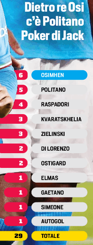 Comanda Victor e alle sue spalle il vice cannoniere della rosa è Politano. Raspadori reduce da tre colpi di fila (Grafico)