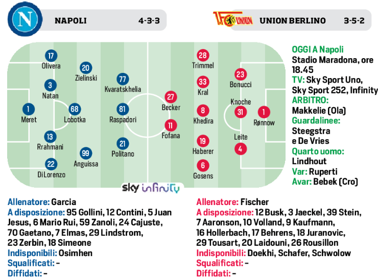 La certezza, considerando anche le parole di Garcia, è il tridente: Raspadori centravanti, sempre più capitale del mondo azzurro dopo i tre gol consecutivi segnati nelle ultime due settimane con l’Union a Berlino, con il Milan e la Salernitana; Politano a destra e Kvaratskhelia a sinistra. E ancora, a centrocampo: Anguissa, rientrato dal primo minuto a Salerno e assente in Germania per infortunio, giocherà la seconda consecutiva dall’inizio al fianco di Lobotka e Zielinski. In difesa, davanti a Meret, linea a quattro con Di Lorenzo, dicevamo Natan, Rrahmani e poi Olivera più di Mario Rui.
