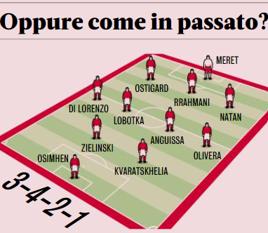 Come nel 2012, ma… Il pregresso però è chiaro, Mazzarri ha sempre oscillato tra 3-5-2, in assoluto il più usato, 3-4-2-1 e 3-4-1-2. Nella Reggina delle tre salvezze consecutive, tra il 2004 e il 2007, la terza delle quali centrata nonostante gli 11 punti di penalizzazione, prevaleva l’opzione tridente spurio, nel senso che uno dei tre davanti, assieme al centravanti e alla seconda punta, era un centrocampista di inserimento o con caratteristiche offensive, tipo il giapponese Nakamura, Tedesco, Vigiani, Cozza. Un modello perpetrato nel biennio alla Sampdoria – con Cassano spesso falso nove, poi a Genova il tecnico toscano virò sul 3-5-2 spinto – e sublimato nella prima volta a Napoli con i tre tenori. La tecno-fisicità di Hamsik, la creatività veloce di Lavezzi e la voracità sotto porta di Cavani: gli ottavi di Champions, la conquista della Coppa Italia 2012, lo scudetto non lontano. Proprio quel Napoli, per quanto schierato con il 3-4-1-2 o 3-4-2-1, può illuminarci sul tridente del Mazzarri 2. Politano-Osimhen-Kvaratskhelia è la composizione classica, ma con Zielinski al posto di Politano si potrebbe creare una situazione simile al 2012. Zielinski come Hamsik; Kvaratskhelia come Lavezzi; Osimhen come Cavani. Zielinski al pari di Hamsik può diventare l’ufficiale di collegamento tra attacco e centrocampo, l’uomo in più davanti o nel mezzo a seconda delle fasi. Come nel 2012, ma con la difesa a quattro anziché a tre, anche perché in questo Napoli i centrali scarseggiano, sono appena quattro: Natan, Rrahamani, Juan Jesus e Ostigard.