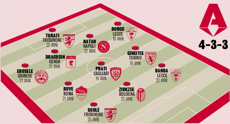 La stella è certamente Matias Soulé, il funambolo del Frosinone e patrimonio della Juve futura. Attorno a lui abbiamo disegnato un undici spumeggiante, con un’età media sbalorditiva: appena 20,72. Un target da sogno per un campionato in cui il Frosinone (con 24 anni e 260 giorni) e il Lecce (24 anni e 294 giorni) sono le società più virtuose con le loro rose verdissime. E la scalata dei vari Dragusin o Prati è la riprova che occorrono i percorsi giusti per mettere in cassaforte il talento, evitando pericolosi giri a vuoto. Bravi loro, ovvio. Ma meritano un plauso anche quei club che hanno preso alla lettera il messaggio della sostenibilità. Non basta investire sui giovani sul piano economico. Occorrono attenzioni e pazienza per non farsi prendere dalla fretta. Proprio Soulé ha debuttato in bianconero senza squilli, ma pochi mesi dopo con Di Francesco si sta esaltando. È in prestito secco e ora ha una valutazione di almeno 30 milioni: virtuale perché Allegri conta su di lui e il biglietto di ritorno a Torino è già pronto. Sempre a Frosinone si sta mettendo in luce il portiere Turati, anche lui in prestito dal Sassuolo. Passato per le giovanili dell’Inter è maturato in fretta per un ruolo impegnativo, visto che tra i pali serve tanta personalità. E veniamo alla difesa. L’uomo di punta è il rumeno Dragusin, acquisito dal Genoa per 6 milioni dopo le prime apparizioni con la Juve. Con Gilardino si sta distinguendo in marcatura e ora va anche a segno. Si prospettano già offerte da 20 milioni, ma i vertici rossoblù in estate contano di aprire un’asta a cifre superiori.