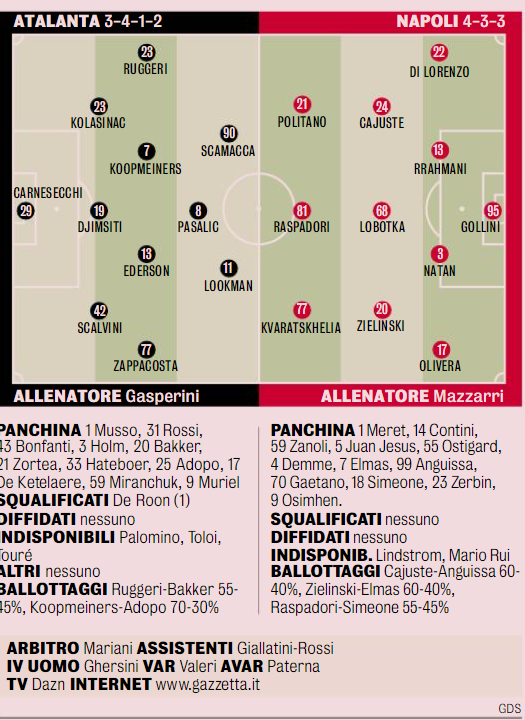 Le probabili formazioni di Atalanta-Napoli