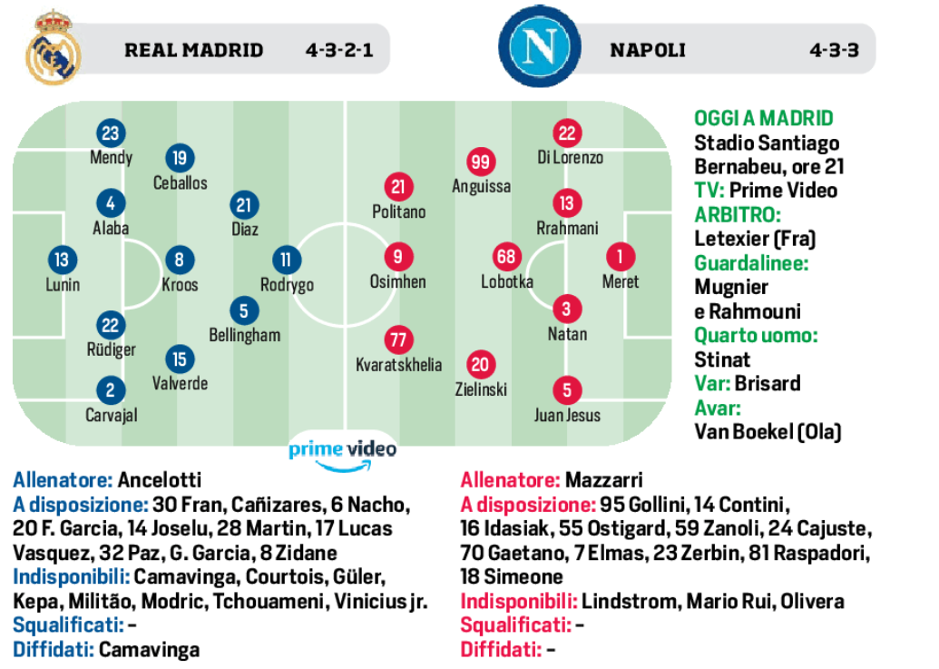 Real Madrid/Napoli: le possibili formazioni secondo il Corriere dello sport (Grafico)