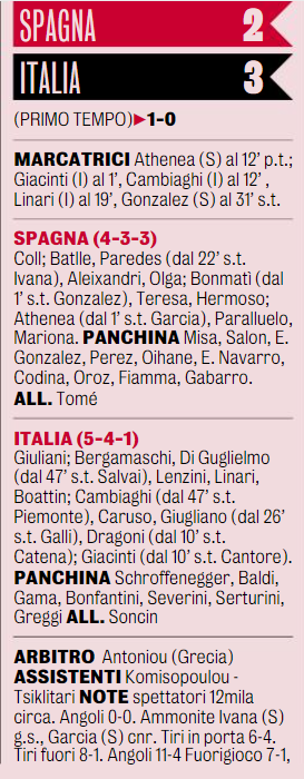 Gran ripresa Abbastanza opaco il primo tempo, in cui la Spagna è passata avanti con Athenea brava a bruciare in uno contro uno Boattin. Dopo l’intervallo, però, il vento a Pontevedra cambia completamente: il pari di Giacinti (assist di Caruso) nasce da un errore con i piedi del portiere Coll. E nel giro di 10 minuti l’Italia piazza un micidiale uno-due, punendo il palleggio lezioso delle spagnole: pallone mangiato da Giugliano in pressing alto, cross per Cambiaghi che di testa trova il suo primo gol in azzurro. Tris da angolo, con Linari feroce nello spingere in porta la sponda della stessa Cambiaghi, migliore in campo. Gonzalez accorcia e c’è da soffrire per un quarto d’ora abbondante, prima dell’esplosione di gioia. E i tormenti del Mondiale, a distanza di pochi mesi, sembrano lontanissimi.