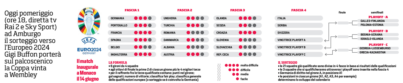 Dalla Elbphilharmonie di Amburgo, la cerimonia del sorteggio dei gironi dei campionati europei 2024, in programma in Germania, giunti alla 17a edizione. Campione uscente l’Italia, reduce dalla finale di Wembley, vittoriosa ai rigori contro l’Inghilterra.