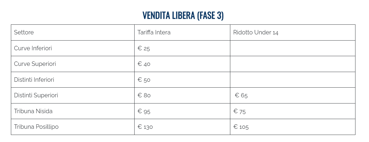 In caso di disponibilità residua di biglietti al termine della Fase 2 e salvo diverse prescrizioni da parte delle competenti autorità, la fase di vendita libera avrà inizio alle ore 12:00 del 04/12/2023 e terminerà ad esaurimento posti (ovvero, in ogni caso, al fischio di inizio della Partita). Ogni tifoso potrà acquistare fino ad un massimo di 4 biglietti, utilizzando la modalità di acquisto Passbook che prevede il caricamento del titolo sul proprio wallet, oppure il biglietto potrà essere emesso in formato cartaceo se l’acquisto avverrà presso uno dei punti vendita abilitati.