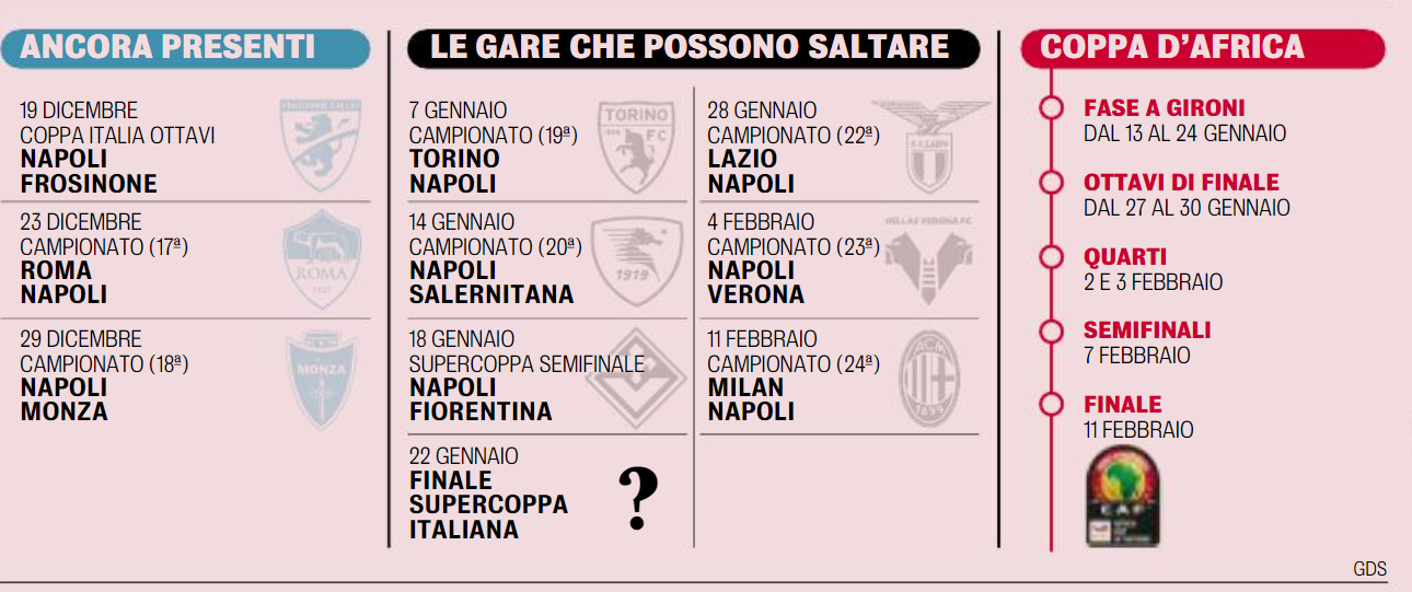 Secondo la Gazzetta, i due azzurri fanno parte di nazionali che non sono le favorite per la vittoria finale ma sono fra le outsider e dunque candidate ad arrivare sino in fondo alla manifestazione che si concluderà l’11 febbraio. Prima di calarsi nello spirito patriottico c’è dunque da battere oggi il Cagliari, poi qualificarsi ai quarti di Coppa Italia superando martedì il Frosinone, dunque la Roma prenatalizia all’Olimpico e il Monza a chiusura del favoloso 2023 per lasciare il Napoli almeno nelle prime quattro posizioni che valgono la Champions. I due calciatori salteranno sicuramente le sfide con Salernitana e soprattutto non ci saranno per le finali di Supercoppa, un trofeo che manca da tempo nella bacheca azzurra, che dovrà fare a meno del suo numero 9 e del suo centrocampista titolare.