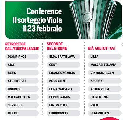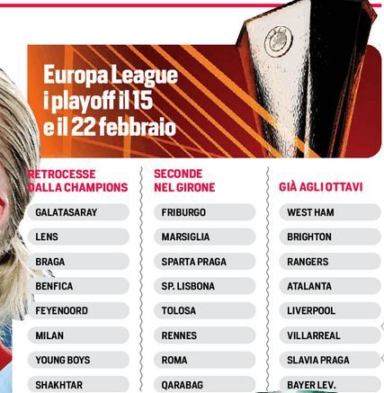 A proposito di lingue, farebbe bene a prendere ripetizioni di francese Stefano Pioli. E non solo perché il Psg lo ha preceduto nel girone di Champions, facendo retrocedere il suo Milan in Europa League. Ta le 7 possibili avversarie del Diavolo ai playoff (il derby con la Roma non è ancora possibile) ben tre, infatti, abitano oltre le Alpi e c’è quasi il 50% di possibilità che i rossoneri peschino una tra Marsiglia, Tolosa e Rennes. Sarebbe meglio girare poi alla larga da Sporting e Friburgo, anche se entrambe sono decisamente meno competitive di Leao e compagni. Mourinho è arrivato secondo nel girone e troverà nell’urna uno di quei famosi “squali” scesi dalla Champions che utilizzeranno l’Europa League (per l’ultima volta) come ancora per salvare la stagione. Girare alla larga dal Feyenoord potrebbe essere un’idea, tanta è la sete di vendetta sportiva degli olandesi, battuti due volte negli ultimi due anni. Il Galatasaray di Icardi e Mertens è la big da scongiurare, al pari del Benfica di Joao Mario e Di Maria. Al netto dei nomi familiari alla Serie A, però, c’è una squadra di giovani che va a mille all’ora e che tutti eviterebbero: lo Shakhtar di Sudakov, il centrocampista che piace tanto alla Juve. Braga, Lens e Young Boys sarebbero ostacoli più soft. Atalanta e Fiorentina restano in attesa: conosceranno la loro avversaria (vincente di un playoff) negli ottavi di Europa League e Conference solo il 23 febbraio.