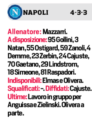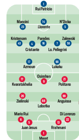 Napoli e Roma, Mazzarri e Mourinho, in questo momento sono più o meno nella stessa situazione: non facile, considerando i risultati. La sconfitta con il Frosinone, la quarta in sette partite da quando è arrivato Walter, ha riaperto una ferita rimarginata dalle due vittorie in fila con Braga e Cagliari e soprattutto ha autorizzato per la prima volta a parlare con maggiore convinzione di crisi. Numeri impietosi: 3 vittorie e 4 ko, dicevamo, con 8 gol fatti e 14 subiti. Un tracollo difensivo che domani dovrà essere affrontato con i rientri di Anguissa e Zielinski a centrocampo, e scegliendo il partner giusto da affiancare a Rrahmani al centro della linea a quattro tra Juan Jesus e Natan. Il vero e unico dubbio di una formazione praticamente già schierata: Meret in porta; Di Lorenzo, Rrahmani, uno tra i colleghi brasiliani e Mario Rui; Lobotka con Frank e Zielo; e il tridente Politano-Osimhen-Kvara.