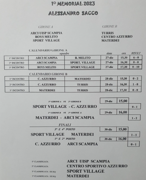 Appuntamento con i giovani, il calcio, Scampia ed Alessandro, al prossimo anno, per dare ancora la possibilità a chi ama il calcio di vedere all’ opera il futuro di questo sport. Di seguito la sintesi delle gare che si sono svolte durante il Memorial: