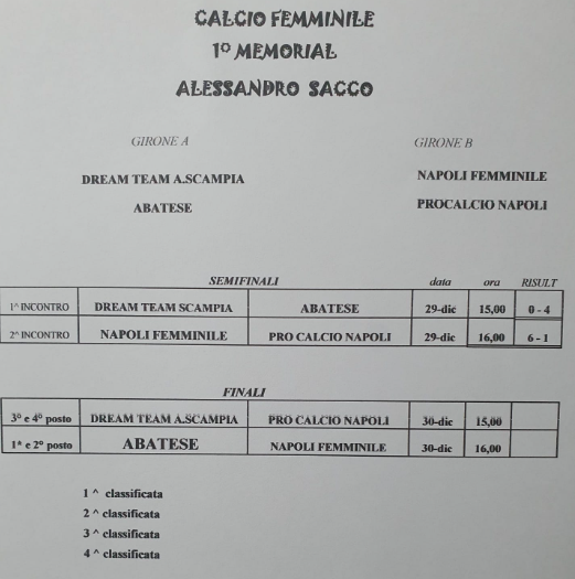 A contendersi il titolo, nell’ ultima gara, C. AZZURRO/ARCI SCAMPIA, con questi ultimi che si sono imposti per 1-0 mentre il NAPOLI FEMMINILE ha avuto la meglio sull’ ABATESE per 5-0.