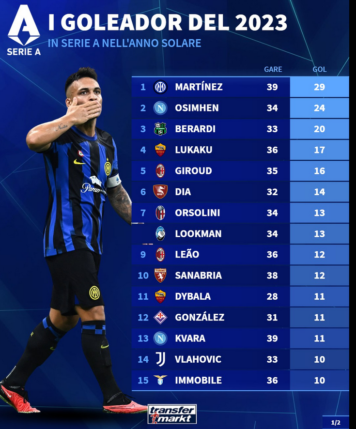 Nei primi 15 posti dei goleador del 2023, figurano due attaccanti azzurri, Osimhen e Kvaratskhelia, rispettivamente con 24 ed 11 reti. L’attaccante nigeriano si ferma al secondo posto, a 5 reti dal leader, il Toro Martinez. La distanza è individuabile nel differente livello prestazionale tra la scorsa annata e quella attuale che il VO9 sta manifestando, oltre ai soliti infortuni che ne limitano un impiego più incisivo.