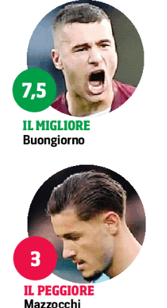 Mazzocchi (1’ st) 3 – All’esordio con la maglia della sua città ha una voglia matta che non controlla. E che dopo 4 minuti si trasforma in un istante di follia: l’intervento su Lazaro è grave, pericoloso, senza senso. E sgretola definitivamente la squadra. Prima espulsione in carriera.