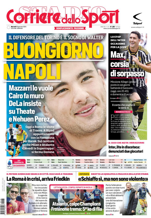 NewsCalcioMercato Da il CdS Campania “BUONGIORNO NAPOLI…..”. Il difensore del Torino fa sognare Walter Mazzarri By Giuseppe Sacco il Gen 16, 2024 - 07:20:15 0 Condividi In prima pagina e nel profilo interno del Cds Campania Factory della Comunicazione BuongiornoCalciomercatoNapoli 0 Condividi FacebookTwitterGoogle+ReddItWhatsAppPinterestE-mail