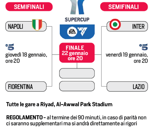 “La competizione prevede la disputa di 3 gare (due Semifinali e la Finale) in tre giorni di gara – si legge nella nota della Lega Serie A – se al termine dei 90 minuti regolamentari il risultato sarà in parità, l’arbitro provvederà direttamente a far battere i tiri di rigore. La prima semifinale andrà in scena il 18 gennaio 2024 (ore 20) e prevede Napoli-Fiorentina, ovvero la vincente del campionato contro la finalista della Coppa Italia. La seconda semifinale metterà di fronte Inter-Lazio, ovvero la squadra vincitrice della Coppa Italia contro la seconda classificata della Serie A: la partita è stata calendarizzata per il 19 gennaio 2024 (ore 20). La finale si giocherà il 22 gennaio 2024 (ore 20) all’Al-Awwal Park Stadium”.
