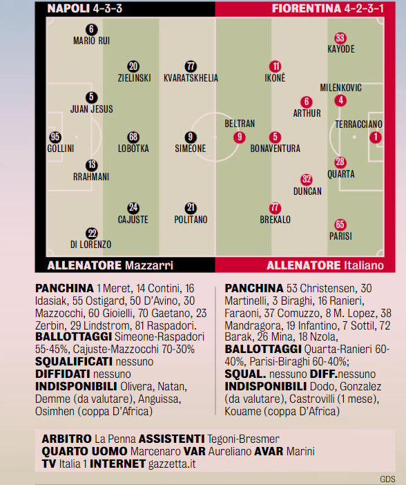 Voglia di festa Ma Melo non aveva ancora incontrato Italiano, che ora punta su di lui per alzare finalmente una Coppa al cielo. Un’ambizione legittima alla luce della crescita costante della sua squadra, nel gioco e nella personalità. Due elementi migliorati in modo esponenziale grazie ad Arthur, nuovo faro viola. E stasera con Lobotka sarà sfida spettacolo, anche per onorare città e allenatori. Napoli e Firenze hanno voglia di far festa, Italiano cerca il primo titolo e Mazzarri vuol dimostrare di essere l’allenatore giusto per rilanciare i campioni d’Italia. Tanti motivi per mettersi comodi a guardare: ciak, si gira. Parola alla regia.