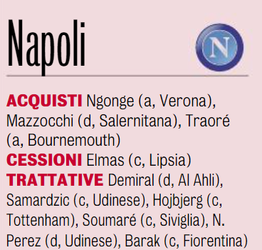 Napoli che per il momento è il protagonista indiscusso tra le big in Serie A in questa sessione di mercato invernale. La squadra campione d’Italia in carica, infatti, è quella che sembra essere pi in difficoltà tra le colleghe e soprattutto quella che non sta assolutamente mantenendo le aspettative previste, degne della passata stagione. Ed è così che De Laurentiis vuole mettere la squadra sulla dritta via (che sembra alquanto smarrita) con una serie di innesti importanti. Di Seguito possiamo vedere in sintesi la situazione, e i nomi, che girano intorno al Napoli: