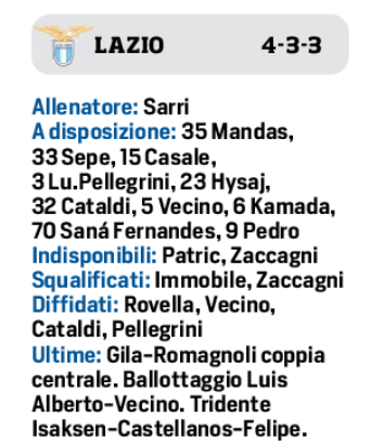 Difficile metterne in campo 11 per parte in discrete condizioni fisiche. Tra squalificati, infortunati ed assenti, Lazio/Napoli sarà giocata “con quelli che ci sono”. In pratica, la famosa scelta dei tecnici in base alle “forze” a propria disposizione, stavolta, definirla limitata è un eufemismo. Il CdS prova a mettere in campo i ragazzi di Sarri e di Mazzarri: