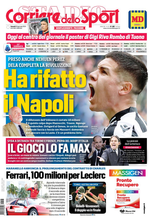 NewsCalcioRassegna Stampa “PRIME PAGINE SPORTIVE”. La rassegna stampa del 26 gennaio By Giuseppe Sacco il Gen 26, 2024 - 07:00:59 0 Condividi In primo piano sui principali quotidiani sportivi nazionali Factory della Comunicazione CalcioNapoliRassegnaStampa 0 Condividi FacebookTwitterGoogle+ReddItWhatsAppPinterestE-mail