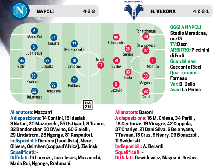NAPOLI-Linea a quattro e un centrocampista in più per alzare il baricentro e avvicinarsi all’altra porta risolvendo il problema del gol o semplicemente del tiro a porta. Con i rinforzi: Mazzarri ritroverà Kvaratskhelia e Simeone, squalificati contro la Lazio, e a loro si unirà il jolly Traore, che verrà convocato per la prima volta e che potrebbe anche debuttare nei minuti finali. La rosa, che accoglie Natan dopo oltre un mese, presto sarà al completo: in attesa di Osimhen, si avvicina il rientro di Meret e Olivera, che ieri hanno svolto personalizzato in campo.
