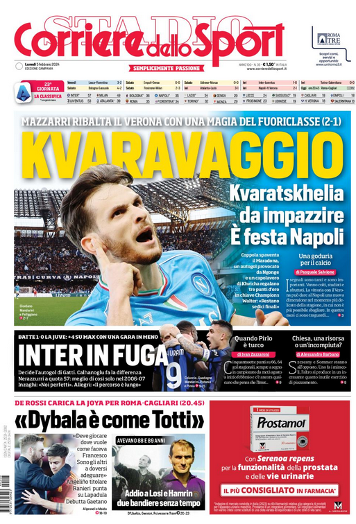 NewsCalcioIn Evidenza Rassegna stampa del 5 gennaio. “PRIME PAGINE SPORTIVE” By Giuseppe Sacco il Feb 5, 2024 - 07:00:45 0 Condividi In primo piano sui principali quotidiani sportivi nazionali Factory della Comunicazione CalcioNapoliRassegnaStampa 0 Condividi FacebookTwitterGoogle+ReddItWhatsAppPinterestE-mail