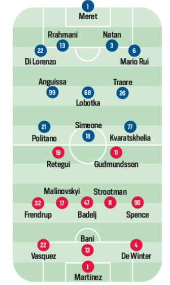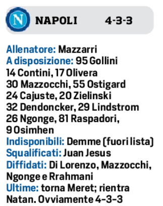 Il Cholito, un gol in campionato contro i 5 di Retegui, sostituirà ancora Osimhen nel tridente, mentre ai suoi fianchi agiranno Kvara e Politano. Al rientro dall’inizio dopo la panchina di San Siro con il 3-5-1-1: domani, però, sarà di nuovo 4-3-3. Con Meret e Natan, rispettivamente fuori dal Monza e dalla Roma, e la sorpresa Traore in tasca. La rifinitura di oggi spiegherà ogni cosa.