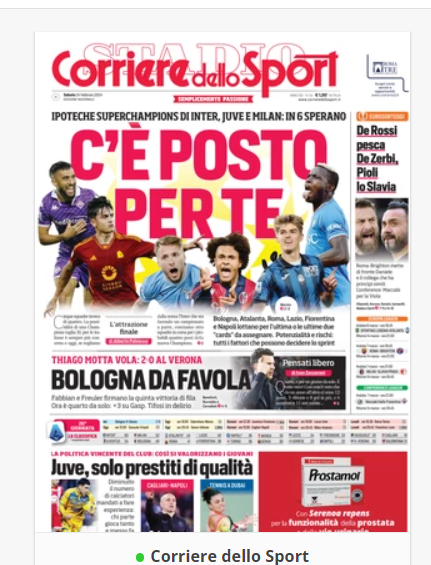 NewsCalcioRassegna Stampa “LA RASSEGNA STAMPA”. Prime pagine sportive del 24 febbraio By Giuseppe Sacco il Feb 24, 2024 - 07:00:13 0 Condividi In primo piano sui principali quotidiani sportivi nazionali Factory della Comunicazione CalcioNapoliRassegnaStampa 0 Condividi FacebookTwitterGoogle+ReddItWhatsAppPinterestE-mail