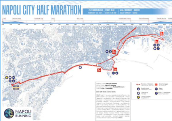 alla Maratona di Boston Marathon 2023 e la sesta piazza ai Campionati del Mondo di Maratona 2022, bagaglio con il quale potrebbe attaccare il record di gara di 1h06:47 del 2020 che appartiene alla keniana Viola Cheptoo. Il fiato sul collo della Tanui è quello dell’etiope Anchinalu Dessie Genaneh già capace di un personale di 1h07:30 fatto segnare alla Stramilano nel 2023. Ai top il compito da fare da battistrada ai seimila runner provenienti da oltre sessanta nazioni a testimonianza di Napoli come una delle mete più ambite per i runners internazionali (2800 da oltre confine). La Napoli City Half Marathon partirà alle 9 da viale Kennedy. Percorso velocissimo che si dipana attraverso via Giulio Cesare, piazza Sannazaro, il lungomare fino alle torri aragonesi di via Marina. Poi giro di boa e si torna alla chiesa di Portosalvo. Virata a destra per piazza della Borsa, ancora a destra verso piazza Nicola Amore, nei pressi secondo giro di boa e galoppata fino a piazza della Borsa prima e via Depretis poi. Infine via Acton e rush finale verso viale Kennedy.
