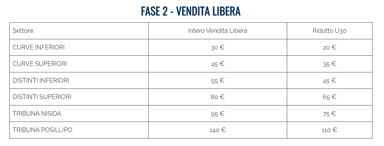 In caso di disponibilità residua di biglietti al termine della Fase 1 e salvo diverse prescrizioni da parte delle competenti autorità, la fase di vendita libera avrà inizio alle ore 12:00 di lunedì 26 Febbraio 2024 e terminerà ad esaurimento posti (ovvero, in ogni caso, al fischio di inizio della Partita). Ogni tifoso potrà acquistare fino ad un massimo di 4 biglietti, utilizzando la modalità di acquisto Passbook che prevede il caricamento del titolo sul proprio wallet. Allo stesso tempo il biglietto potrà essere emesso in formato cartaceo se l’acquisto avverrà presso uno dei punti vendita abilitati.
